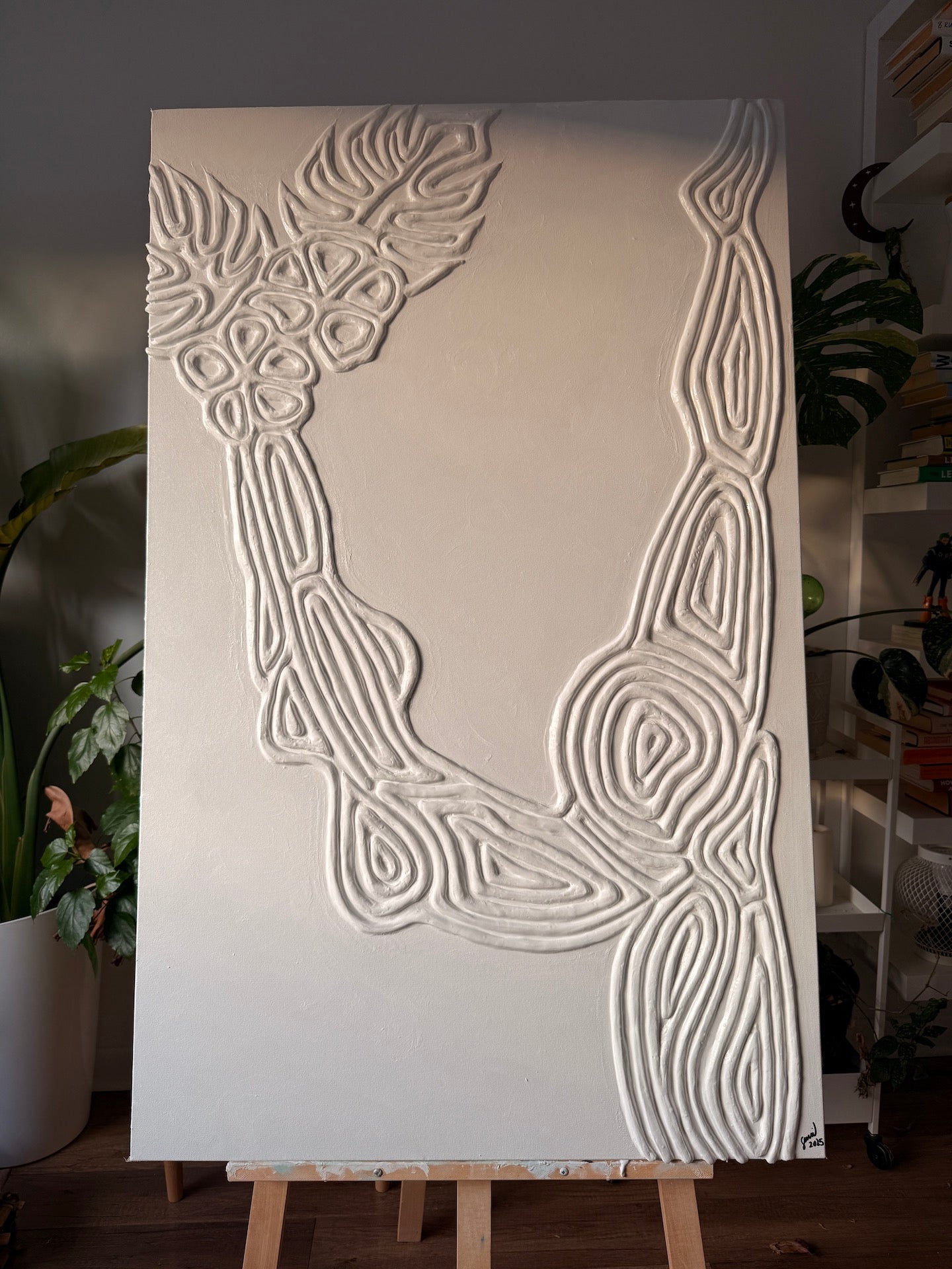 The final work reveals a woman fully embodied: fluid, strong, and in motion. Her yoga pose, the pigeon, evokes the opening of the hips, the seat of emotional memory. Her body is aligned, powerful, and grounded. Leaves merge with her hands, symbolizing a profound connection to herself, to nature, and to all living things. This is the ultimate image of rebirth: a woman fully inhabiting her being.